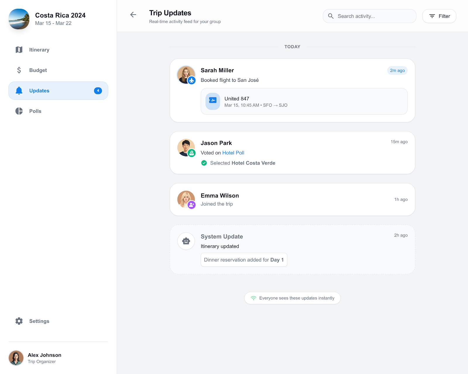 Flight booked? Hotel changed? New restaurant added? Everyone sees it instantly. No forwarding, no screenshots, no missed messages.